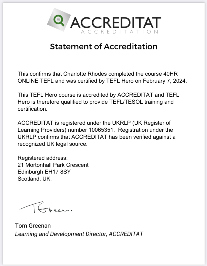 - TEFL Accredited: I hold TEFL qualifications, ensuring top-notch instruction.